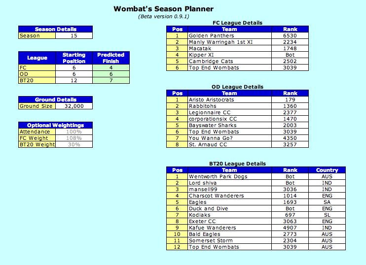 * FC and BT20 attendance is calculated as a percentage of your OD attendance. Over the last five seasons, my average income for a FC match has been 139% of an average OD game, whilst the average income from a BT20 match has been 32% of an average OD game. If you find that your ratios are different, then you can adjust these to suit.